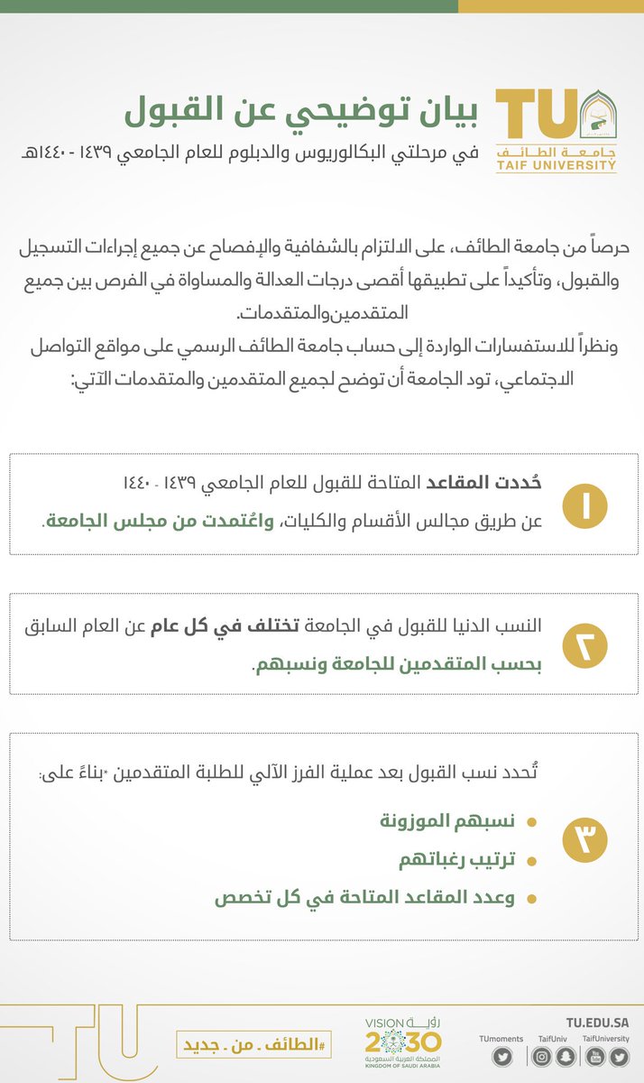 نسب قبول جامعه الطائف, ÙØ³Ø¨ اÙÙØ¨ÙÙ ÙÙ Ø§ÙØ¬Ø§Ù عات 1440 : نسب القبول في جامعة الطائف كل التخصصات 1443 تم الإعلان حول نسب القبول في جامعة الطائف في تخصصات مرحلة البكالوريوس للعام الدراسي 1442/1443، وتلك النسب أتت وفق مستوى الثانوية العامة لذلك العام…. وعلى هذا سيتم إعلان النتائج و نسب قبول جامعة الطائف لعام 1443 في يوم 22 من شهر ذي الحجة لعام 1442 هجريًا. نسب القبول للعام ١٤٤٢/١٤٤١ هـ. نسب القبول في جامعة الطائف 1443. هناك الكثير من النسب ذات العلاقة بالقبول بالبكالوريوس للطالبات والتي تختلف عن نسب قبول الطلاب، حيث عادةً ما تكون نسبة قبول الطالبات أقل من نسب الطلاب، وقد قامت الجامعة بوضع نسب قبول الطالبات في الجامعة على النحو الآتي: تنقسم نسب القبول في جامعة الطائف 1443 على حسب فئات مختلفة وهي: