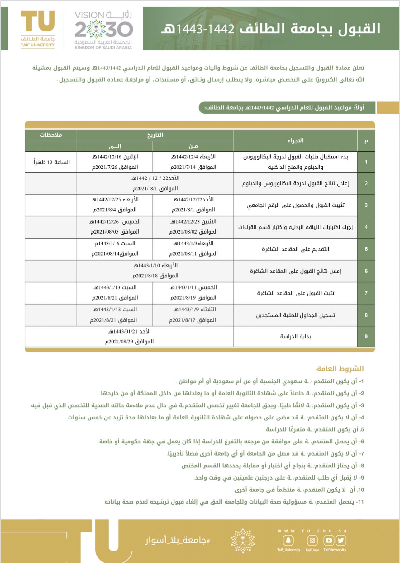 جامعة الطائف تطلق مبادرة الطائف بلسان واحد. معدل الالتحاق بجامعة الطائف هو 1443 للكثير ممن يرغبون في الالتحاق بالجامعة بعد تخرجهم من الثانوية ، حيث توجد العديد من التخصصات المختلفة بالجامعة. نسب القبول للعام ١٤٤٢/١٤٤١ هـ. تبلغ نسبة القبول في جامعة الطائف 1،443 شخصًا يرغبون في الالتحاق بالجامعة بعد التخرج من الثانوية العامة ، حيث يوجد في الجامعة العديد من التخصصات. حددت نسبة قبول كلية الصيدلة في جامعة الطائف لتكون ثمانية وثمانون وثمانية عشر بالمائة.